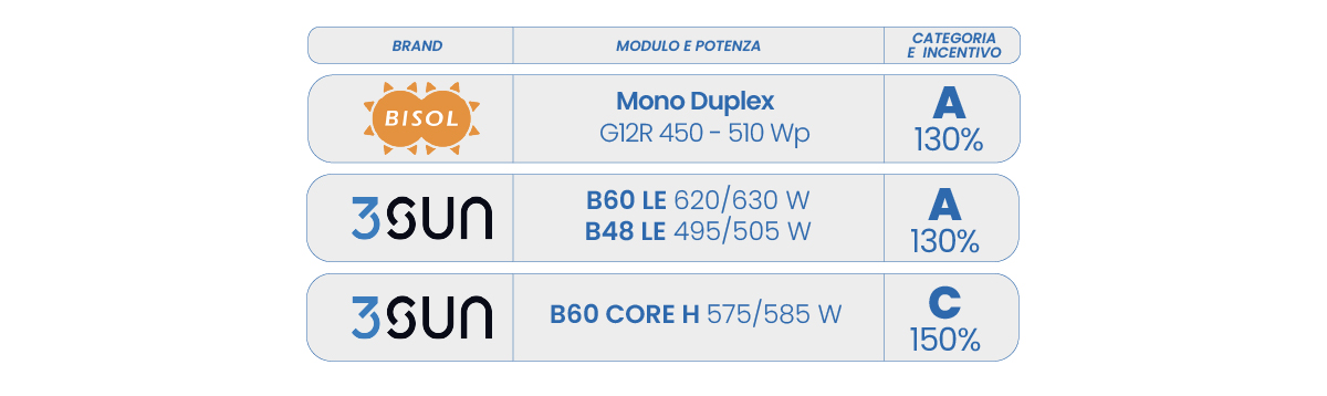 Transizione 5.0: incentivi fino al 45% per impianti fotovoltaici con moduli europei certificatiEnergia Italia ti presenta una selezione di moduli fotovoltaici made in EU per accedere agli incentivi previsti dal Piano Transizione 5.0. I brand disponibili includono 3Sun e Bisol. La misura prevede un credito d’imposta fino al 45% per le imprese che investono in tecnologie 4.0 in grado di garantire una reale riduzione dei consumi energetici. Sono agevolabili anche i costi per impianti fotovoltaici, a patto che impieghino moduli europei certificati e inseriti in un progetto complessivo di efficientamento. |