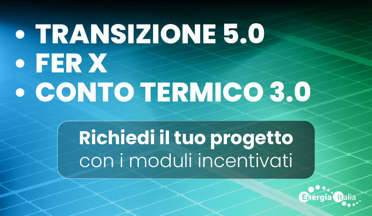 Domande frequenti sulla Transizione 5.0Chi può accedere agli incentivi del Piano Transizione 5.0?Possono accedere tutte le imprese residenti in Italia che investono in tecnologie digitali e sostenibili, finalizzate alla riduzione dei consumi energetici. Quanto vale il credito d’imposta?Il credito d’imposta varia dal 35% al 45% in base al livello di efficientamento raggiunto rispetto ai consumi energetici precedenti. Quali moduli fotovoltaici sono ammessi all’incentivo?Sono ammessi solo moduli europei certificati. Energia Italia propone moduli idonei dei marchi 3Sun e Bisol. Serve una certificazione per accedere al beneficio?Sì, è necessario presentare documentazione tecnica che attesti la riduzione dei consumi e la conformità dei moduli fotovoltaici alle specifiche richieste. |
